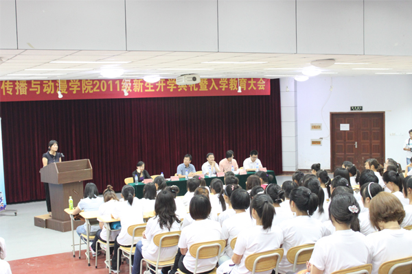 9月13日下午4:00,传播与动漫学院2011级新生开学典礼暨入学教育大会在大学生活动中心举行。学校学生处副处长秦姣、传播学院党总支书记张鸣、常务副院长阎瑜、副院长曲国先、党总支副书记兼副院长魏琳以及11级各专业班主任和分团委老师参加了本次大会。会议由传播学院分团委书记刘名森主持。