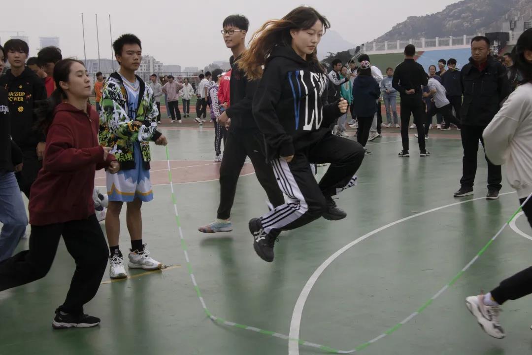 大绳队的同学们随着大绳触地的有力节奏,从翻飞的大绳下鱼贯而出,轻轻一跃,衣角飞扬。同学们配合默契,即使中途出现失误,大家依然能够沉着冷静,调整状态,以最佳的精神面貌参与比赛。