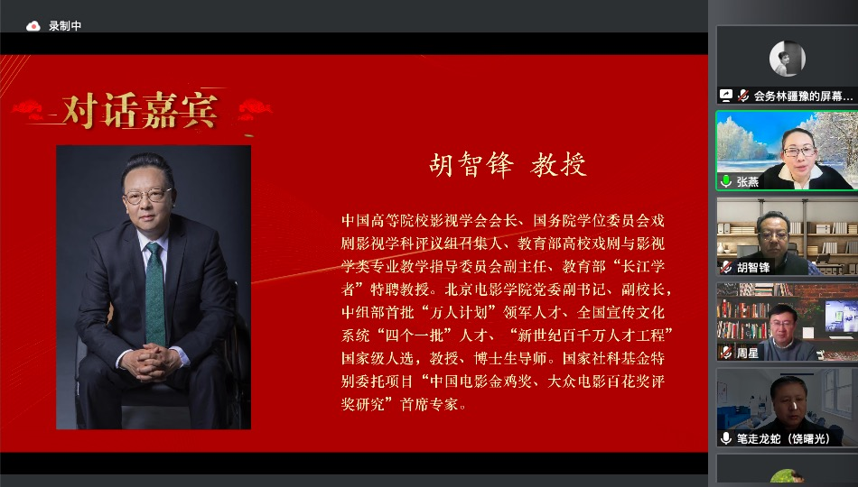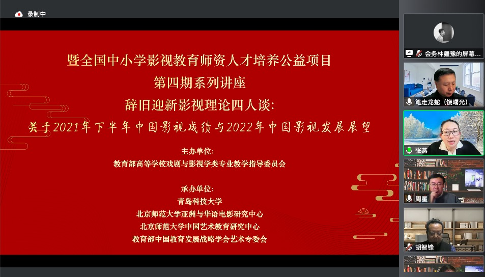 与教育部中国教育发展战略学会艺术专委会、中国艺术学理论学会艺术教育专业委员会、北京师范大学中国艺术教育研究中心共同承办教育部高校戏剧与影视学类专业教学指导委员会主办的审美与向善:戏剧与影视名师大讲堂”系列讲座第四季第二十讲一讲座,邀请中国电影评论学会会长饶曙光研究员、北京电影学院党委副书记胡智锋教授、中国高校影视学会会长丁亚平教授、北京大学陈旭光教授共同就“关于2021年下半年中国影视成绩与2022年中国影视发展展望”一题于云端开展精彩学术论坛。周星教授为本次学术论坛作精彩点评。张燕教授为本次论坛做全程主持,北京师范大学艺术与8x8x
