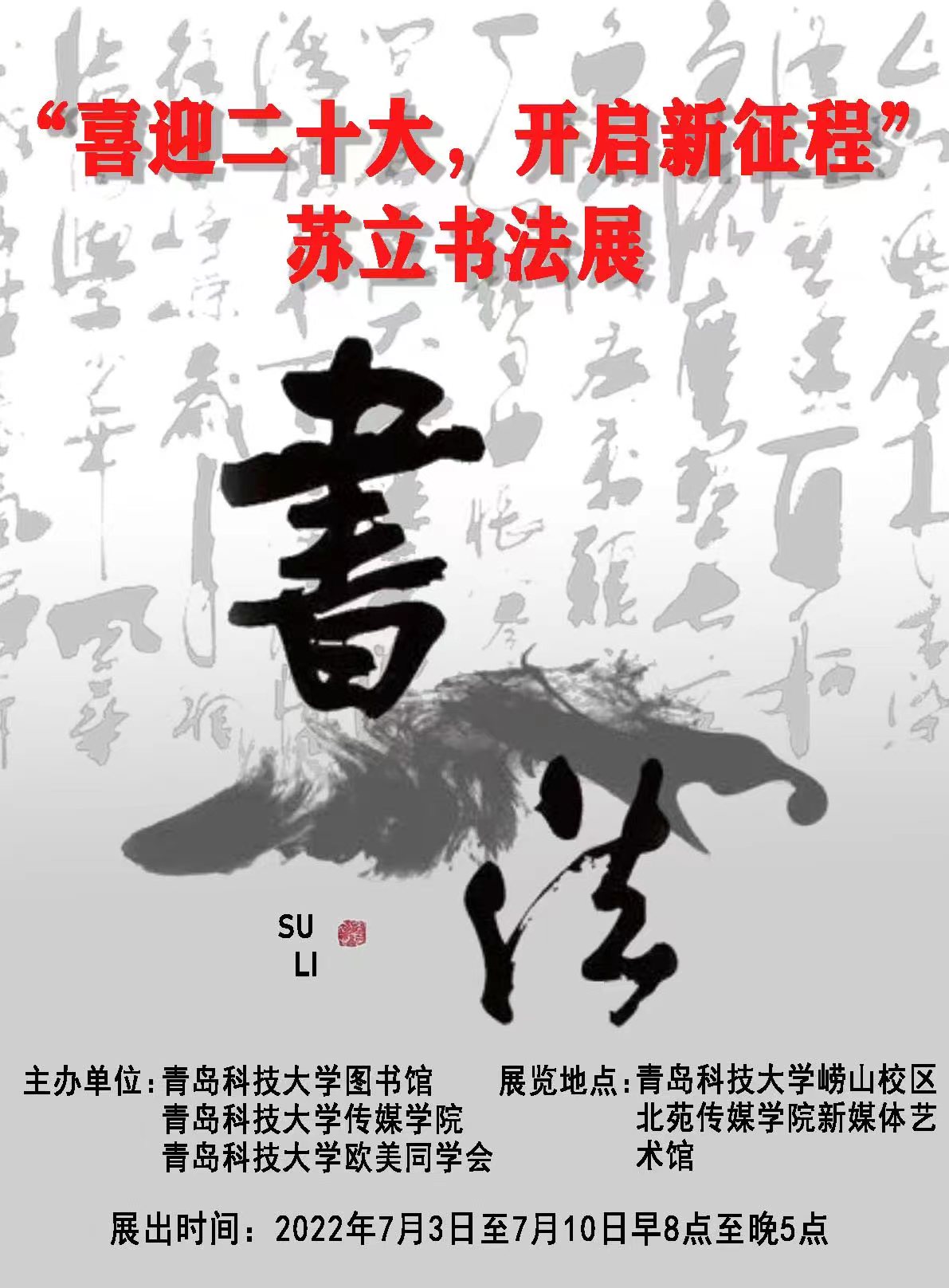 “喜迎二十大 开启新征程”苏立书法展从7月3日持续到7月10日,每天展出时间为8:00-17:00。展览结束后,这70幅作品将全部捐献给学校图书馆。