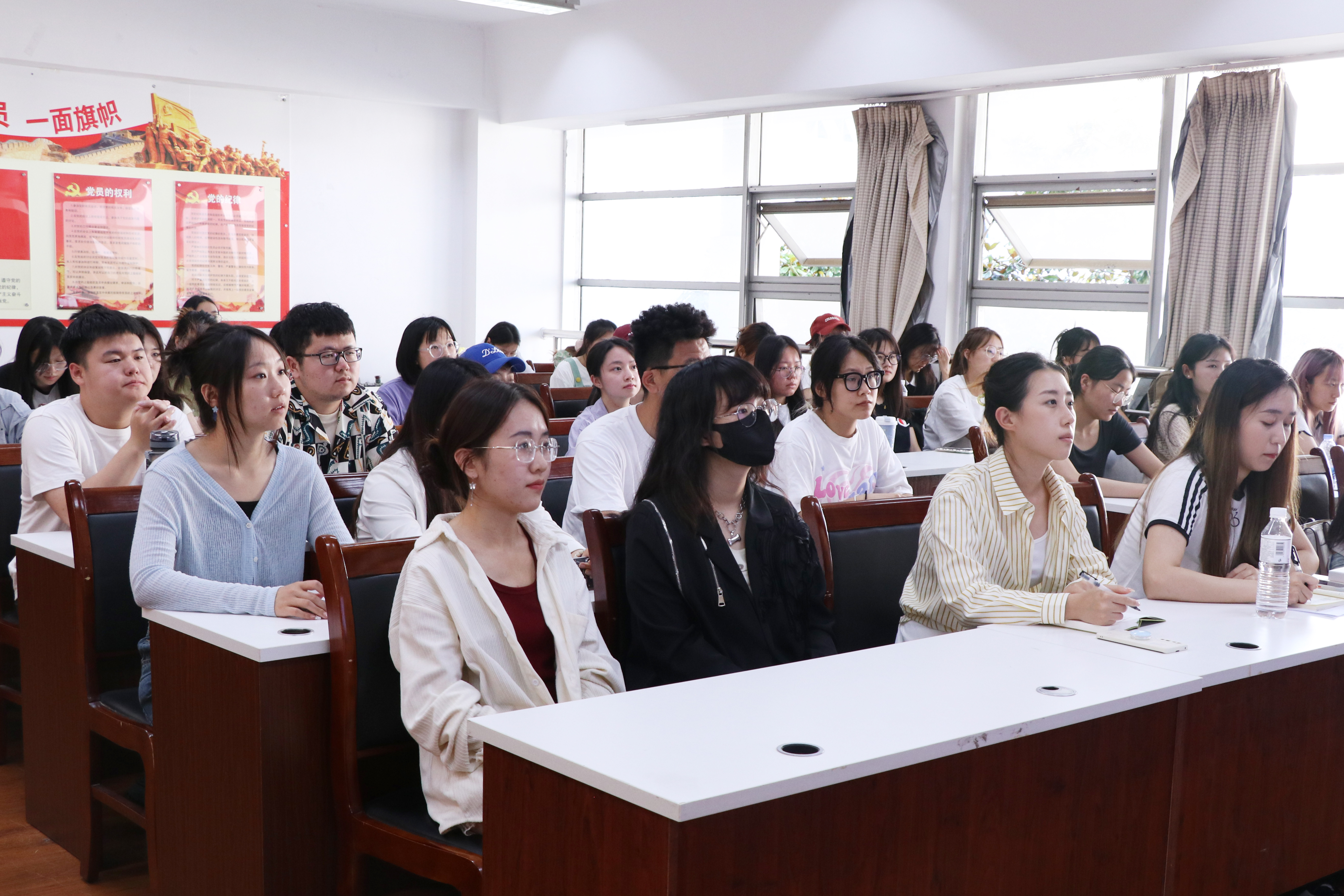 党总支书记刘志国主讲,2023届毕业生党员代表,其他年级党员代表参加活动。