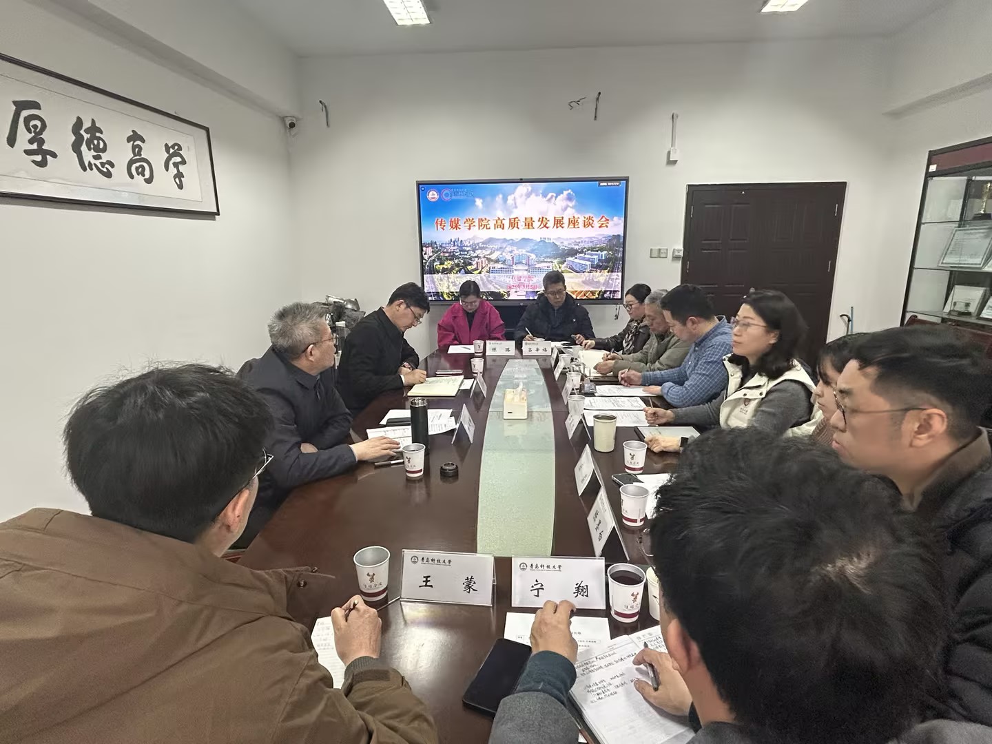 在学科建设、教学科研和人才培养等方面取得的成效,并对学院高质量发展提出四点要求:一是明确定位,特色发展。要科学谋划学院“十五五”发展规划,紧密结合学校优势学科,打造具有高辨识度的传媒学科专业特色,注重与化工、计算机等学科交叉融合,走特色发展之路,构建新质学科集群。二是加强师资,提升水平。要强化教师梯队建设,对高层次人才、学科带头人和青年骨干教师等分层分类精准施策,解决“卡脖子”技术难题;同时要通过研修深造、产学研践习等方式培育现有师资,柔性引进行业人才,支撑学院高质量发展。三是合作开放,强化实践。要构建开放协同的办学格局,通过项目制、工作坊、研究中心等途径深化与企业和国内外高校合作共建,探索“课程共建-项目共研-人才共育”等模式。要争取“引进来”全国性、行业性学术会议,并鼓励师生“走出去”参加学术交流,培养具有全球胜任力的传媒人才。四是党建引领,加快发展。要加强党对教育工作的全面领导,坚持党建引领,提高人才培养质量,坚持党管宣传,守好意识形态阵地。要充分发挥学院党委会、党政联席会作用,落实“三重一大”制度,把牢正确办学方向。要加强党建与业务融合,结合师生所思所想、所愿所盼,解放思想、改革创新,以高质量党建引领学院高质量发展。