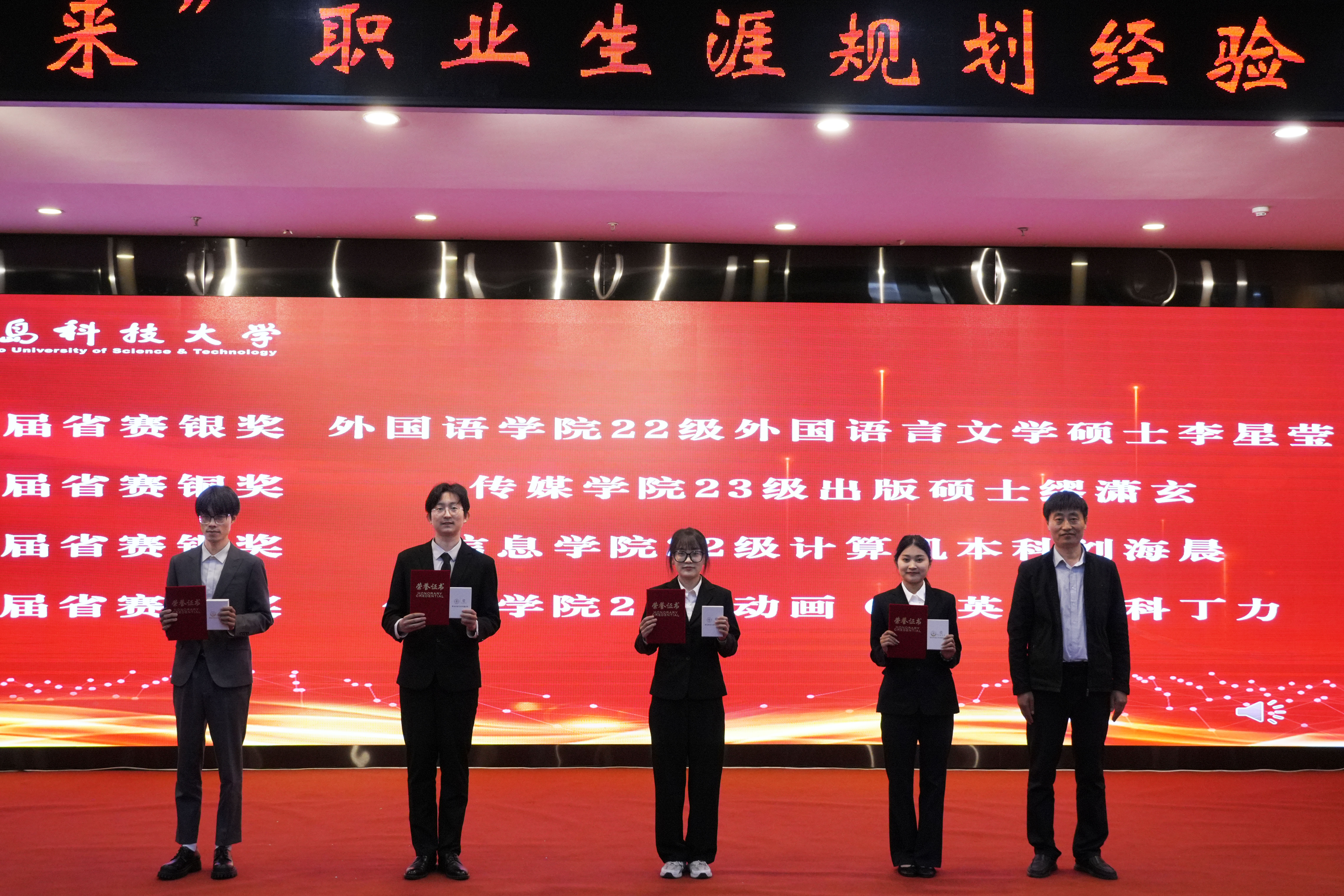 徐华为获得第一届山东省大学生职业规划大赛银奖的李星莹、铜奖的缪潇玄,以及第二届山东省大学生职业规划大赛银奖的刘海晨、铜奖的丁力颁发证书和纪念品。