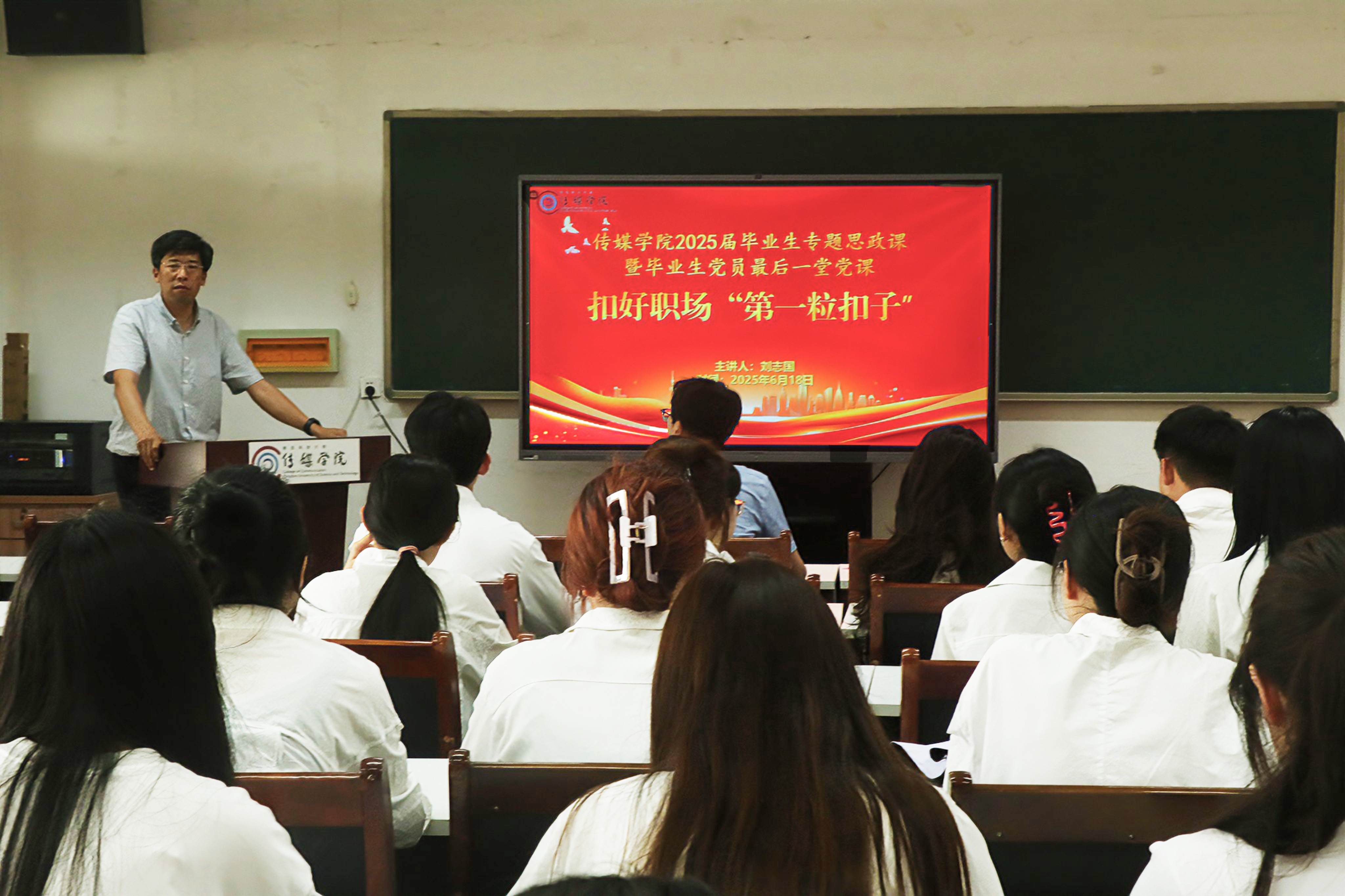 为深化大学生思想政治教育,强化毕业生党员理想信念,6月18日下午,传媒学院党委书记刘志国以扣好职场“第一粒扣子”为题,在学院310会议室讲授2025届毕业生专题思政课暨毕业生党员最后一堂党课。课堂由学院辅导员赵岩主持。