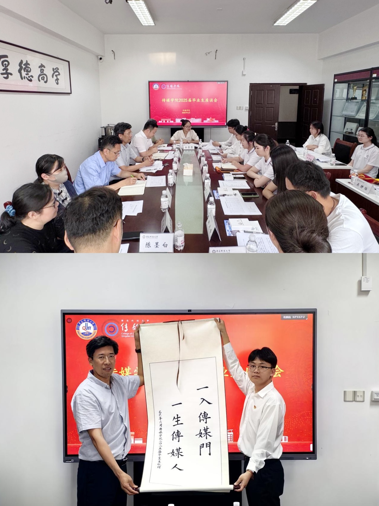 共叙离别情谊,同绘发展蓝图。学院院长张洪坤、党委书记刘志国及领导班子成员、教师代表、10名学生代表等参加2025届毕业生座谈会,围绕学院发展、教育教学、人才培养、职业规划等话题展开交流。张洪坤对同学们建言献策表示感谢并简要回应,希望毕业生们坚定政治方向、把握时代大势、树立终身学习的理念,拥抱新技术,赋能新未来。毕业生代表刘嘉玮向学院敬赠“一入传媒门,一生传媒人”书法作品,刘志国代表学院接受毕业生赠送,并向毕业生代表回赠定制文创盒。与会领导老师鼓励毕业生坚定信心,保持韧劲,坚持锻炼,保持阳光心态,积极为中国式现代化贡献传媒力量。