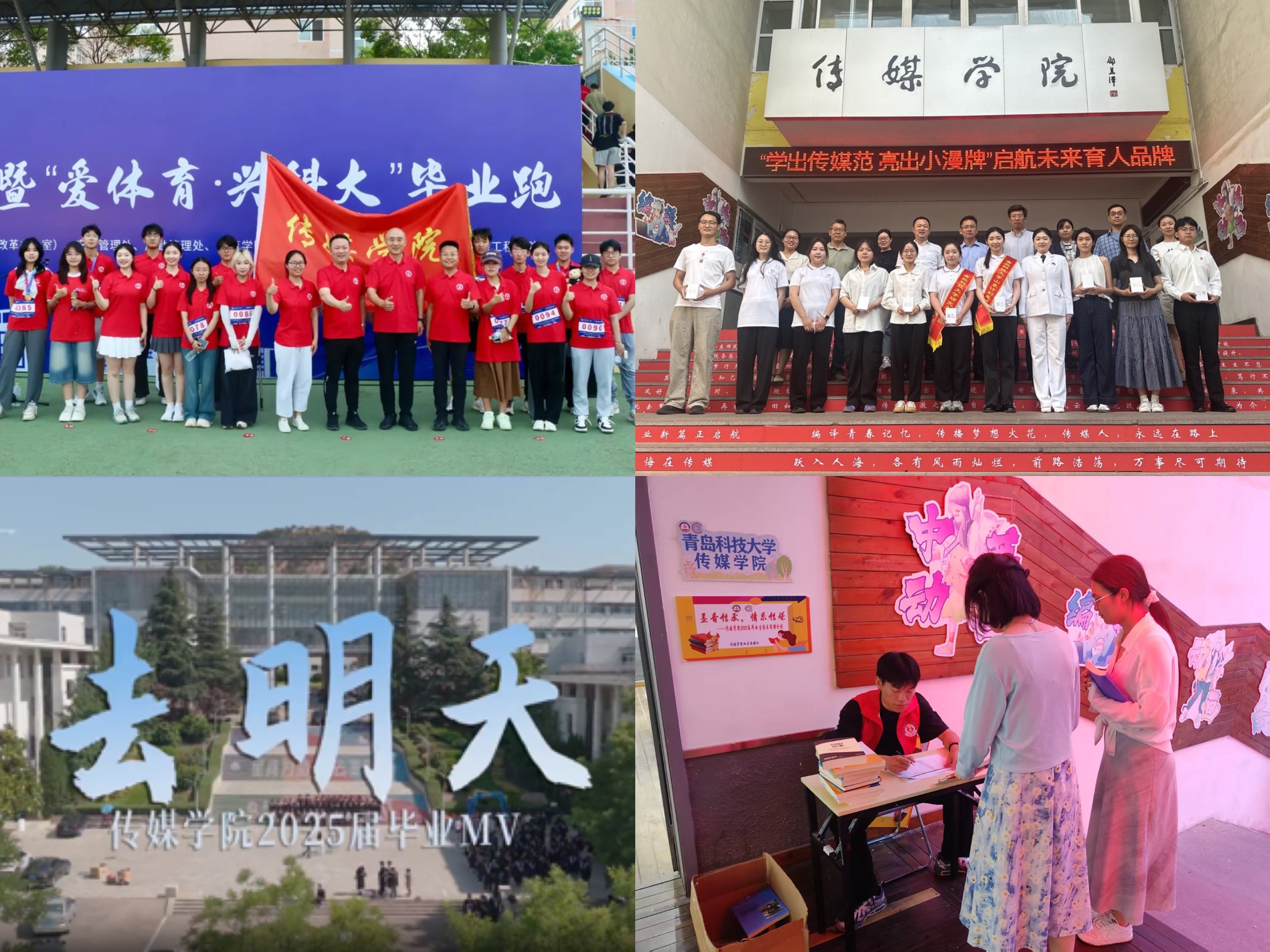 精心设计制作,营造浓厚氛围。学院台阶处贴满毕业寄语,有专业特色的动漫形象张贴在台阶两侧,2025届考研、就业光荣榜有序陈列,展现传媒特色和传媒学子昂扬向上的精神风貌。学院还设置毕业生拍照打卡点,拍摄毕业MV《去明天》,用影像定格青春,留下“传媒”独家记忆;组织学生参加毕业跑,开展毕业季学院、宿舍清扫行动及书籍捐赠活动,向全体毕业生赠送专属文创纪念品,发布“启航专访”等榜样引领推文,系统设计多重元素营造浓厚毕业氛围。