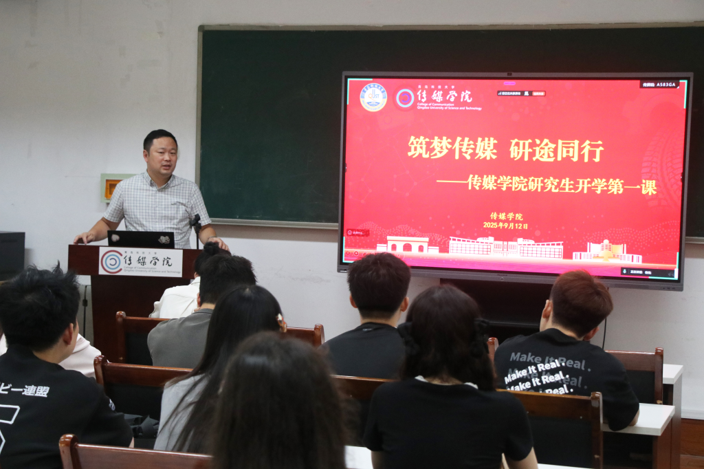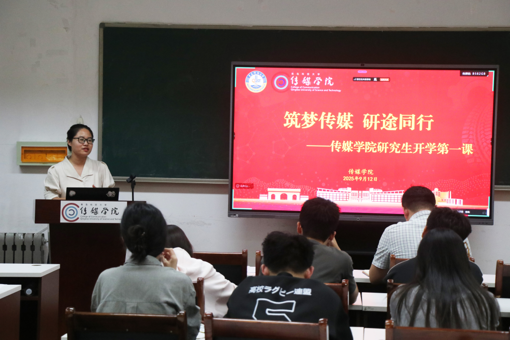 召开2025年秋季学期“筑梦传媒 研途同行”研究生开学第一课,学院党委副书记兼副院长刘海波出席并讲话,第一课由学院团委副书记兼学工办副主任金莹莹主持。