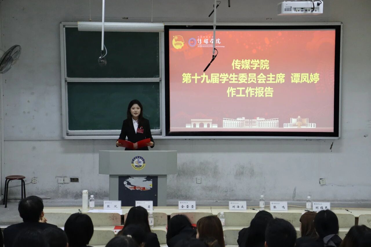 第十九届学生委员会代表谭凤婷作第十九届学生委员会工作报告,从思想引领、制度建设、宣传工作、合作交流、活动成效等方面做总结,大会审议并通过该报告。