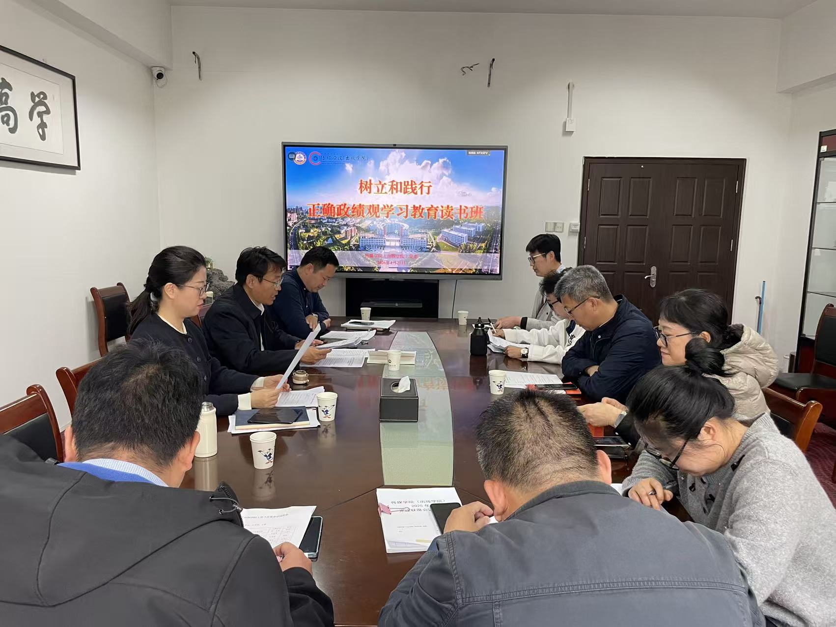 于315会议室召开党委理论学习中心组学习(扩大)会议暨树立和践行正确政绩观学习教育读书班。学院领导班子成员、全体党委委员等参加学习,读书班由学院党委书记孙洪广主持。