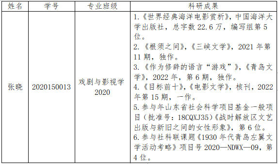 2022年研究生国家奖学金评审实施细则》,经过个人申请、资格审查、现场答辩、评审委员会评审,拟推荐戏剧与影视学2020级张晓为8x8x