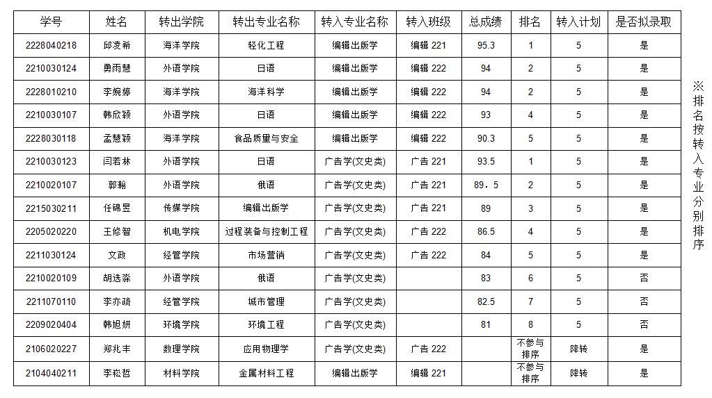 根据青岛科技大学以及8x8x 本科生转专业考核工作安排,经学生自主报名,转出、转入学院审核、转入专业考核等流程,对2022-2023-2学期申请转入8x8x 的同学考核成绩以及排名公示如下:
