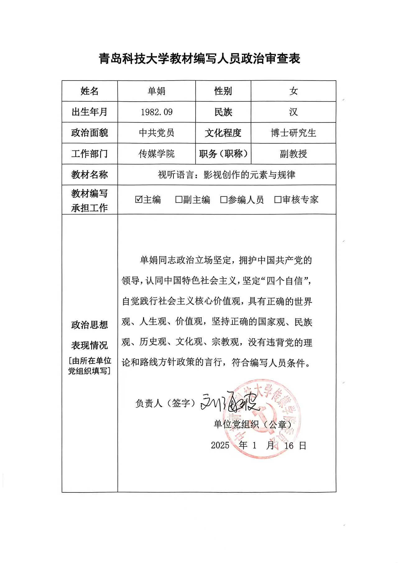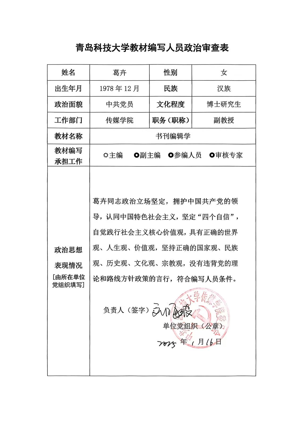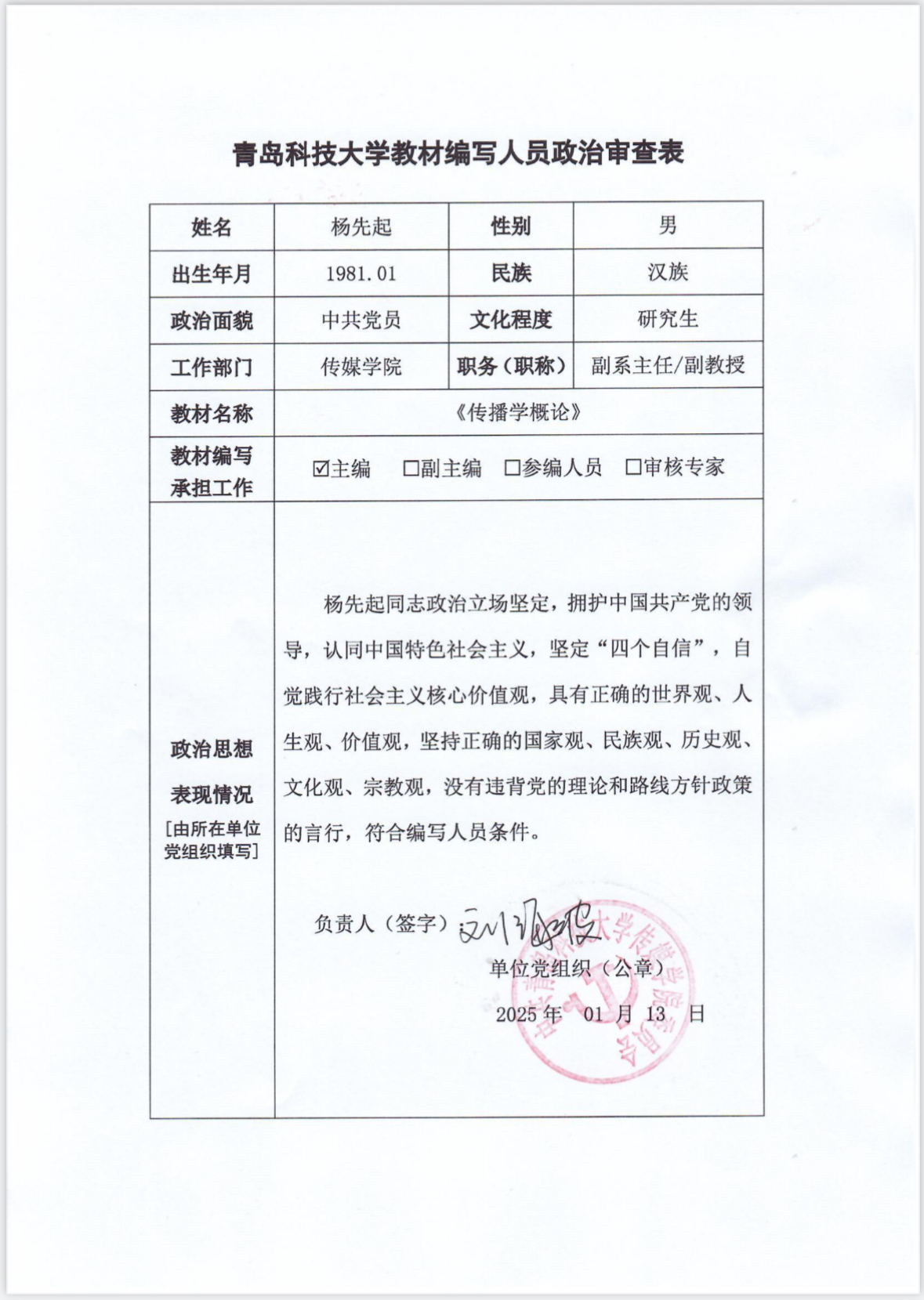 经青岛科技大学8x8x 党委会审核同意,对教材编写人员葛卉、杨先起、单娟政审情况予以公示,公示期为5天(2025年1月16日-20日),如有异议,请在公示期内向8x8x 教学办反映。