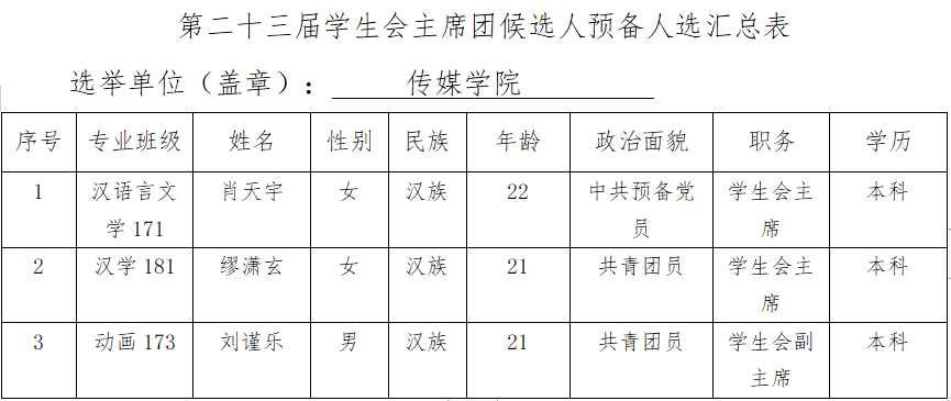 (二)第四届学生委员会主席团拟定3人,根据《中国共产主义青年团章程》和《中国共产主义青年团基层组织选举规则(暂行)》有关规定,在广泛征求各方面意见的基础上,经各选举单位推荐、团委审核、院党委同意,第四届学生委员会委员推荐候选人预备人选为5人。为便于各代表团深入讨论、充分酝酿,第四届学生委员会主席团的选举工作采取无记名等额投票的方式分代表团进行大会预选,产生正式代表。