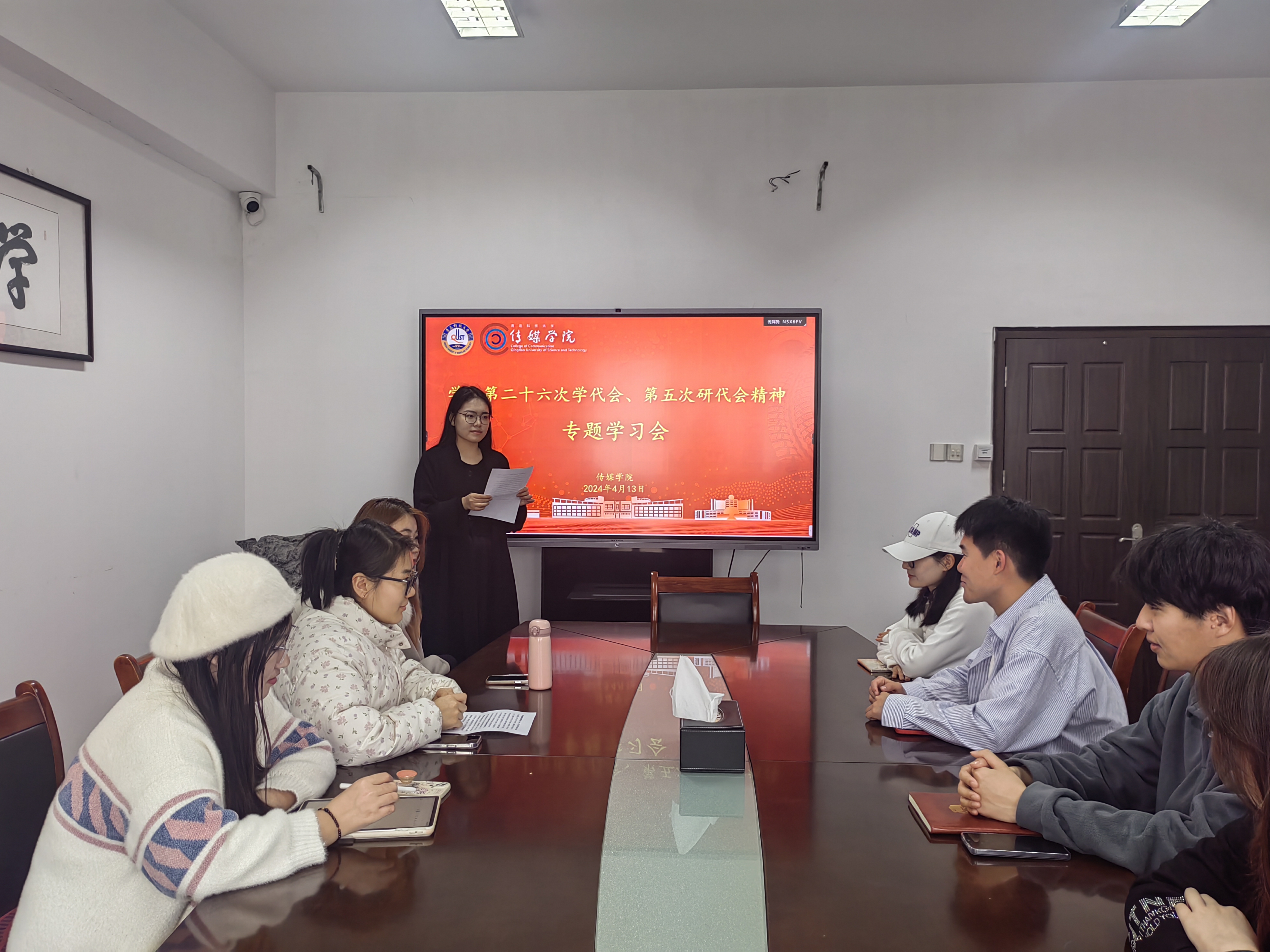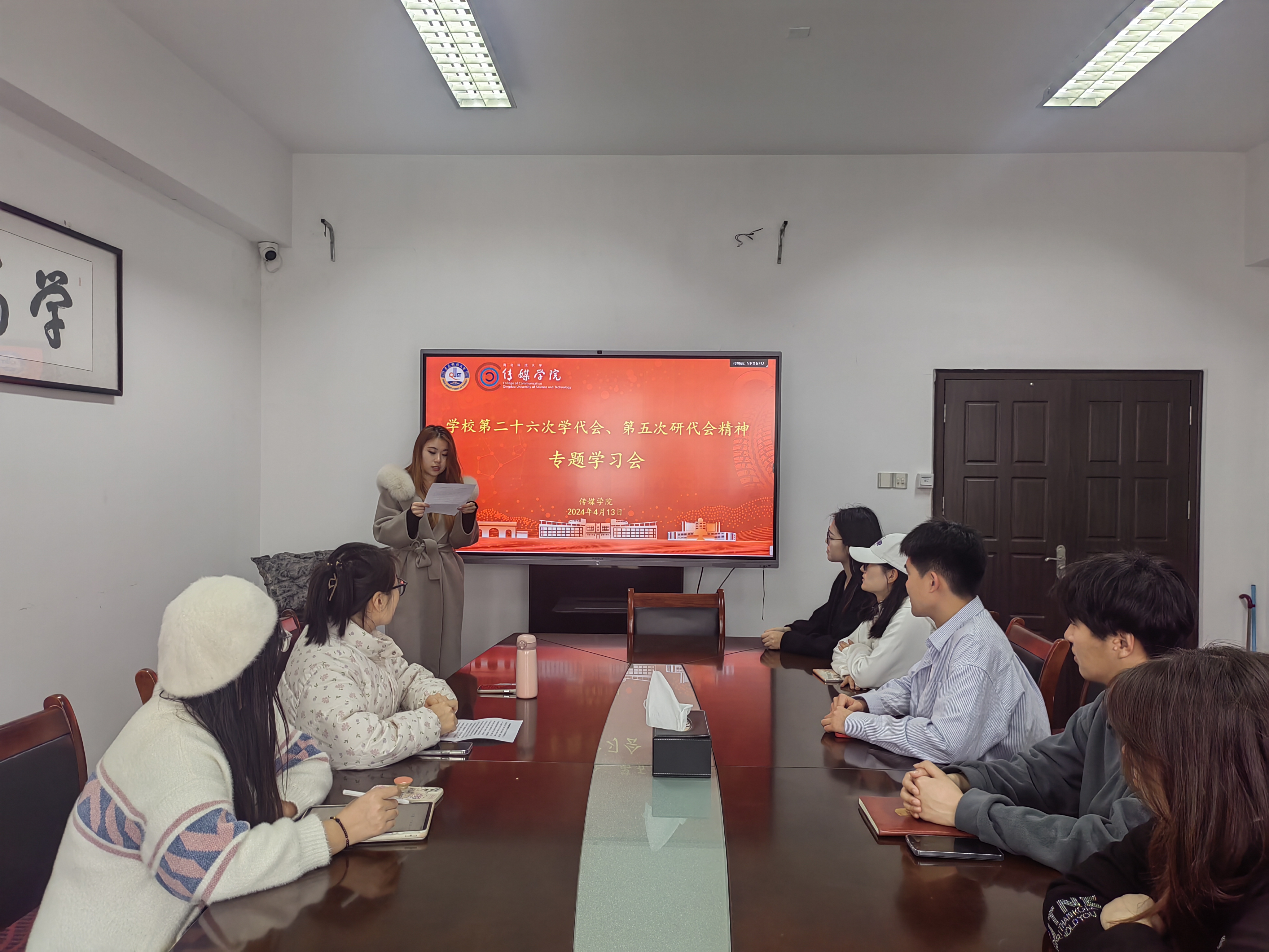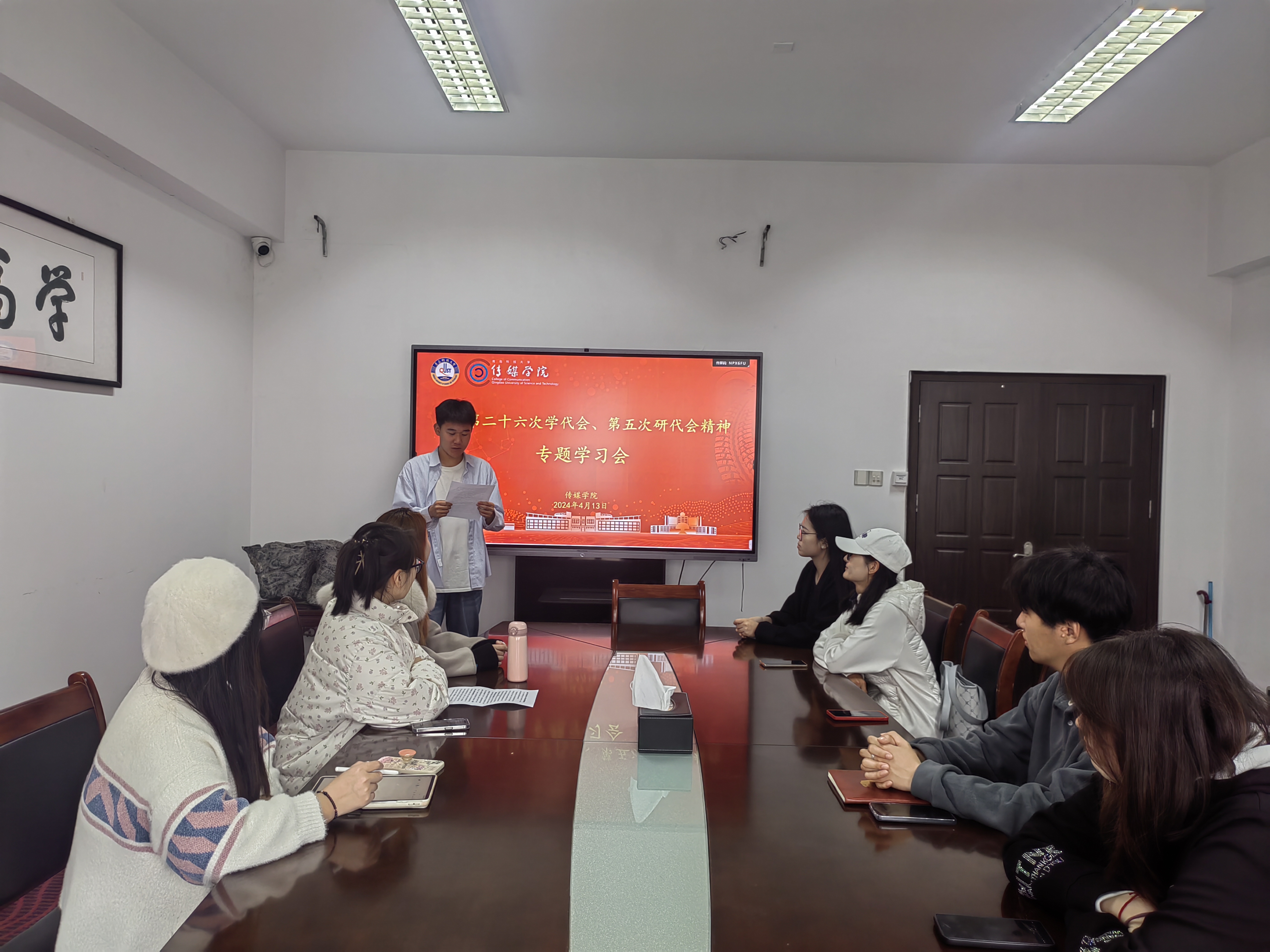 于315会议室召开学习贯彻学校第二十六次学代会、第五次研代会精神专题会议。学院学生会主席团、研究生会主席团及骨干成员参加会议。