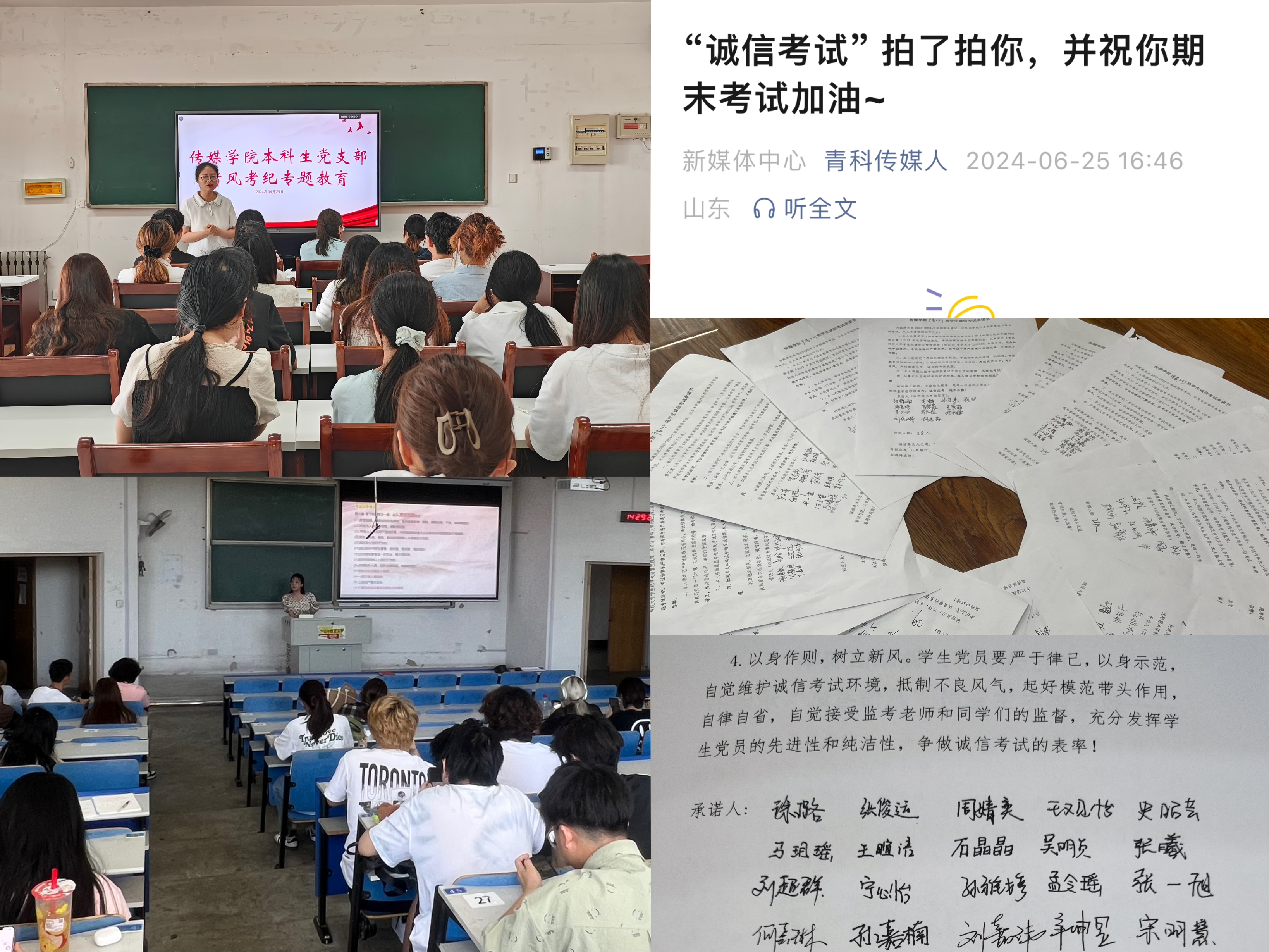 抓实党员群体。6月25日,学院本科生党支部、研究生党支部书记分别开展考风考纪教育专题党课,组织全体学生党员以领学与自学的方式集中学习《青岛科技大学学生纪律处分管理规定(修订)》、《青岛科技大学学生纪律处分警示教育案例选编》等相关规定和要求,并集体签订《立党员标杆,做诚信表率--致全体学生党员诚信考试承诺书》,确保党员群体自律诚信、带头践行。抓牢全体学生。各年级辅导员以班会等形式召开考风考纪主题班会,通过对学校相关纪律处分规定的学习和考试违纪作弊案例分析,以及观看《青岛科技大学考风考纪警示教育宣传片》等形式,让学生们深刻认识到考试违纪的严重后果。组织宿舍党员网格员做期末考试复习技巧、期末季心理调试等内容分享,用身边人身边事激励引导学生树立考试信心。组织学子签订《诚信考试承诺书》,引导全体学生树道德之风、立诚信根基。加强网络育人。组织学生立足专业优势,绘制诚信考试“大角牛”专属表情包,并在官微发布《“诚信考试”拍了拍你,并祝你期末考试加油》原创推文,全方位营造良好的诚信考试氛围。
