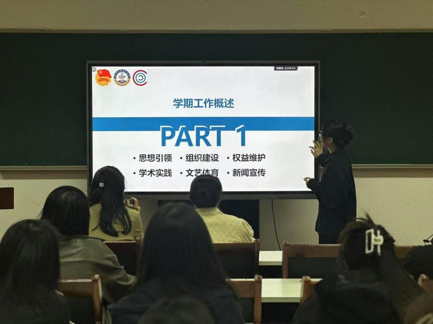 研究生会执行主席缪潇玄结合上学期开展学生工作情况、存在问题不足和下步计划举措作工作报告。