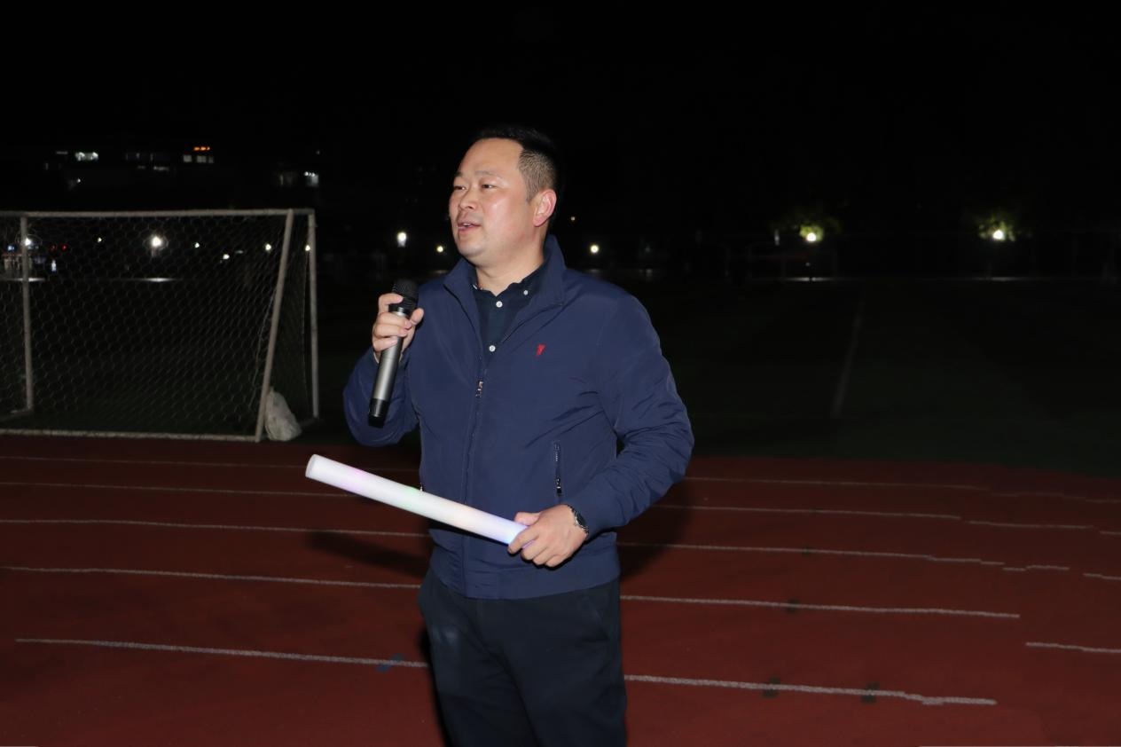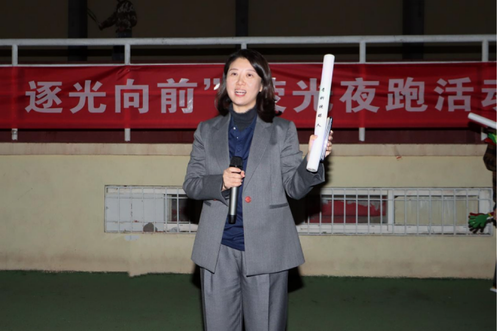 石晨旭作跑前动员讲话。她强调了“健康第一”的教育理念,指出荧光夜跑不仅帮助同学们在运动中享受乐趣、增强体质、更有助于健全人格、磨砺意志,她鼓励大家主动走向操场、走进自然,让体育锻炼成为生活的常态,使健康体魄成为青春的底色,奋斗精神成为成长的内核。