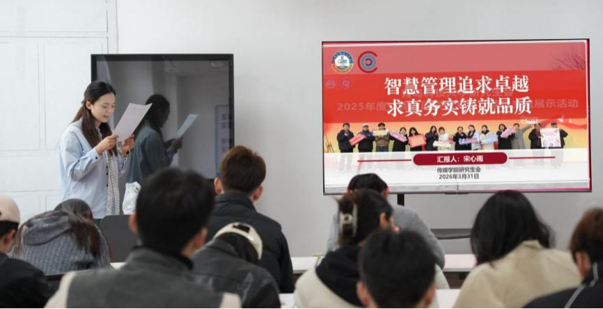 金莹莹老师充分肯定了研究生会上学期的工作成效和全体成员的辛勤付出,同时提出三点希望:一是坚定理想信念,牢记初心使命,将个人成长融入学校学院发展和时代需求;二是坚持服务为本,贴近同学、倾听心声,真正当好桥梁纽带;三是锤炼过硬本领,在实践中提升组织协调、沟通表达和解决问题的能力。希望大家以此次表彰为新起点,以先进为标杆,以奋斗为底色,在学习上追求卓越,在工作中勇于担当,在新时代展现青科传媒研究生的青春风采。
