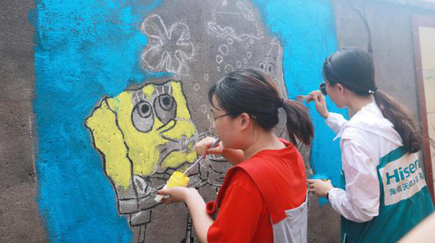 为了见证这次的活动,志愿者们采取了墙绘的方式,在兰村小学留下了志愿活动的印记。早上九点开始上课之前,志愿者们就已经在讨论墙绘的分工,并选出一部分孩子来对前一天准备好的布绘进行填色,那是见证海信、兰村小学与学院第一次交汇的一幅画,更是这次活动留下的一个印记。