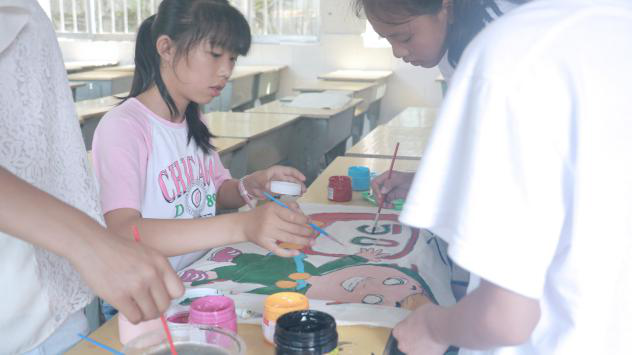 在讨论结束后志愿者分成了两部分,一部分在教室里带着小朋友们进行绘画兴趣班的学习,另一部分则开始了墙绘的绘制。