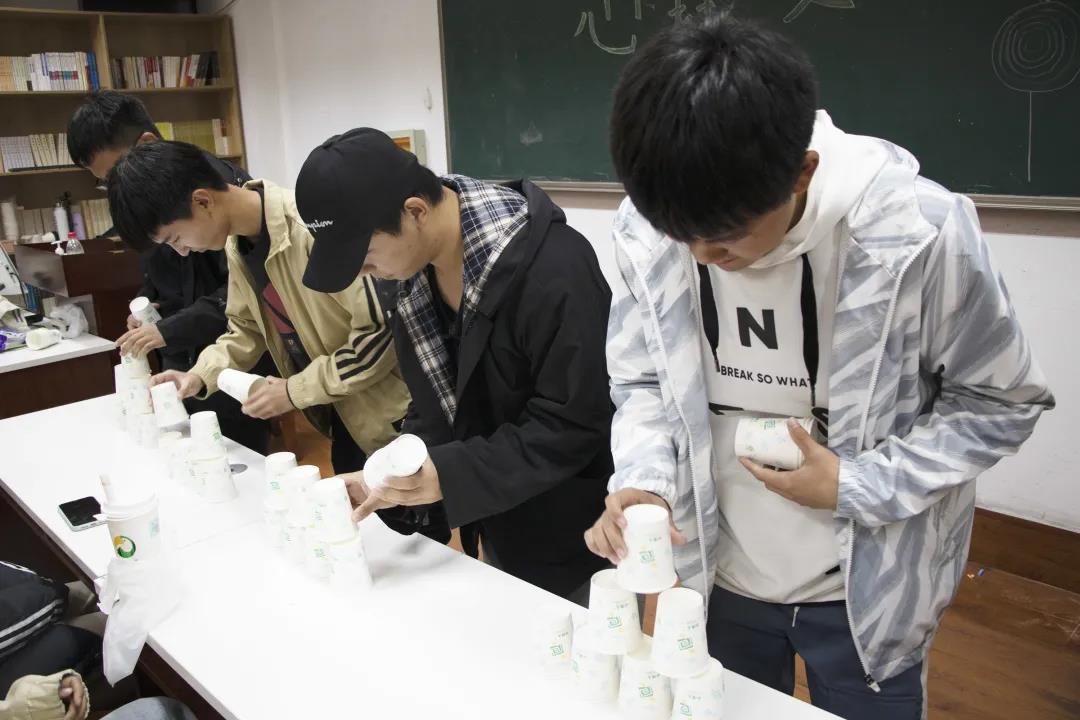 随后,各组抽出一名同学进行“叠杯塔”游戏:将一叠纸杯迅速分开再搭成宝塔的形状。随着一声开始,同学们慌忙搭建“杯塔”,难免手指不稳,楼倒塔塌。大家见状调整呼吸,改为“稳健战略”,不慌不忙,稳扎稳打,终于成功将最后一个纸杯稳稳叠了上去。“叠杯塔”游戏有利于提高同学在压力下的心理调整能力,增强大家做事的耐心。