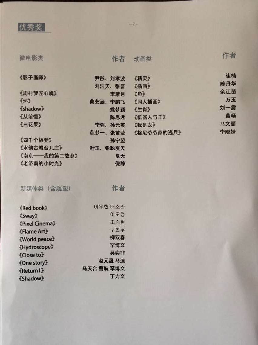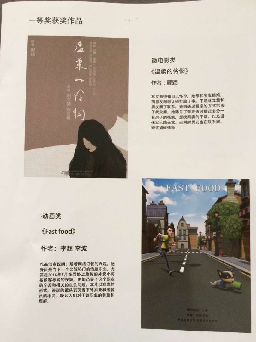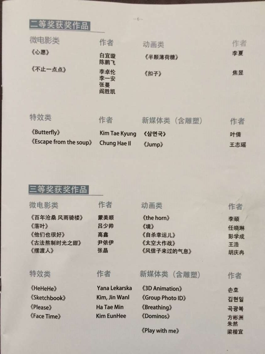本次活动自今年5月开始以来,共收到来自韩国中央大学、北京电影学院、青岛科技大学等国内外10所高校, 124部作品。经过专家评审,韩国中央大学作品《360VR》获新媒体类一等奖、韩国中央大学作品《Father》获特效类一等奖、北京电影学院现代创意媒体学院作品《温柔的怜悯》获微电影类一等奖、青岛科技大学作品《Fast food》获动画片类一等奖。